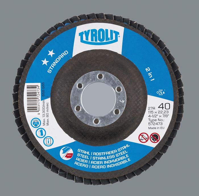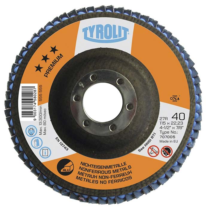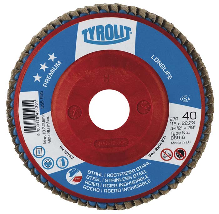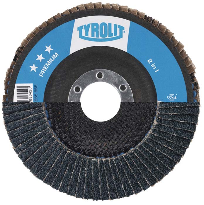 O disco flap premium tyrolit é um disco de desbaste e acabamento para metais de longa durabilidade, tendo um núcleo que é fabricado em fibra de vidro o que lhe confere maior flexibilidade, utilizado para o desbaste de aço, possuindo diversos modelos diferentes para cada tipo de aço, como por exemplo o disco flap premium tyrolit Cerabond , que é utilizado para o desbaste de aço inoxidável, ou o disco flap premium tyrolit longlife, tendo seu uso no desbaste de aço carbono, e pode também ser utilizado com aço inoxidável.